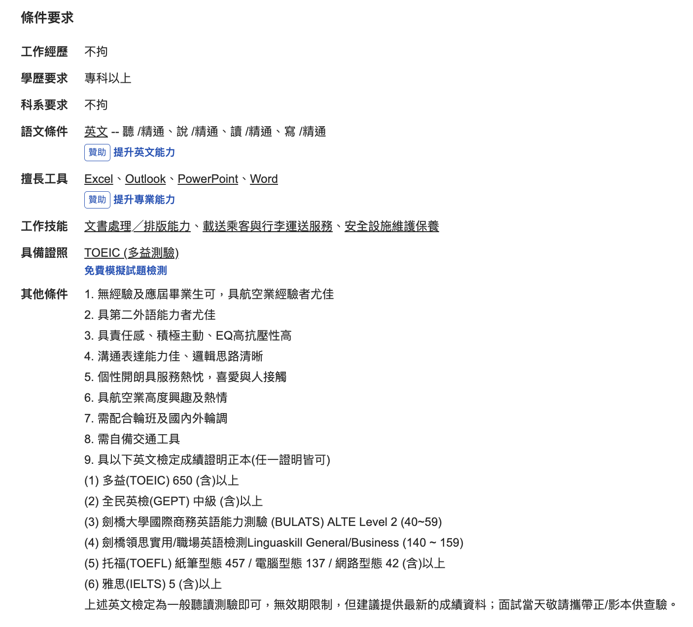 運務員大學以上畢業就可以投囉,男女不拘,多益成績650分以上(或是等同成績),目前開放報名中,趕快告訴大家難得的機會吧!